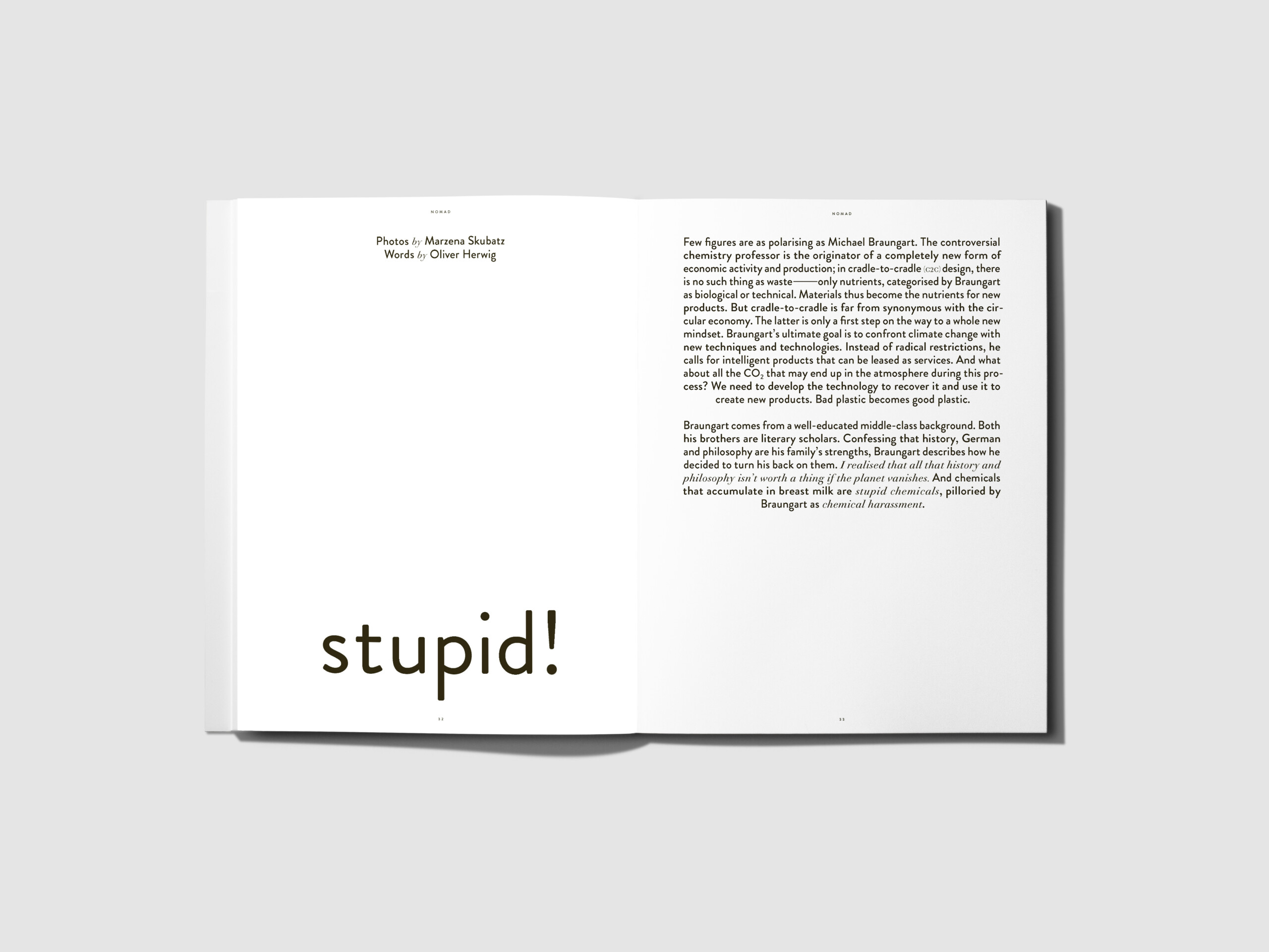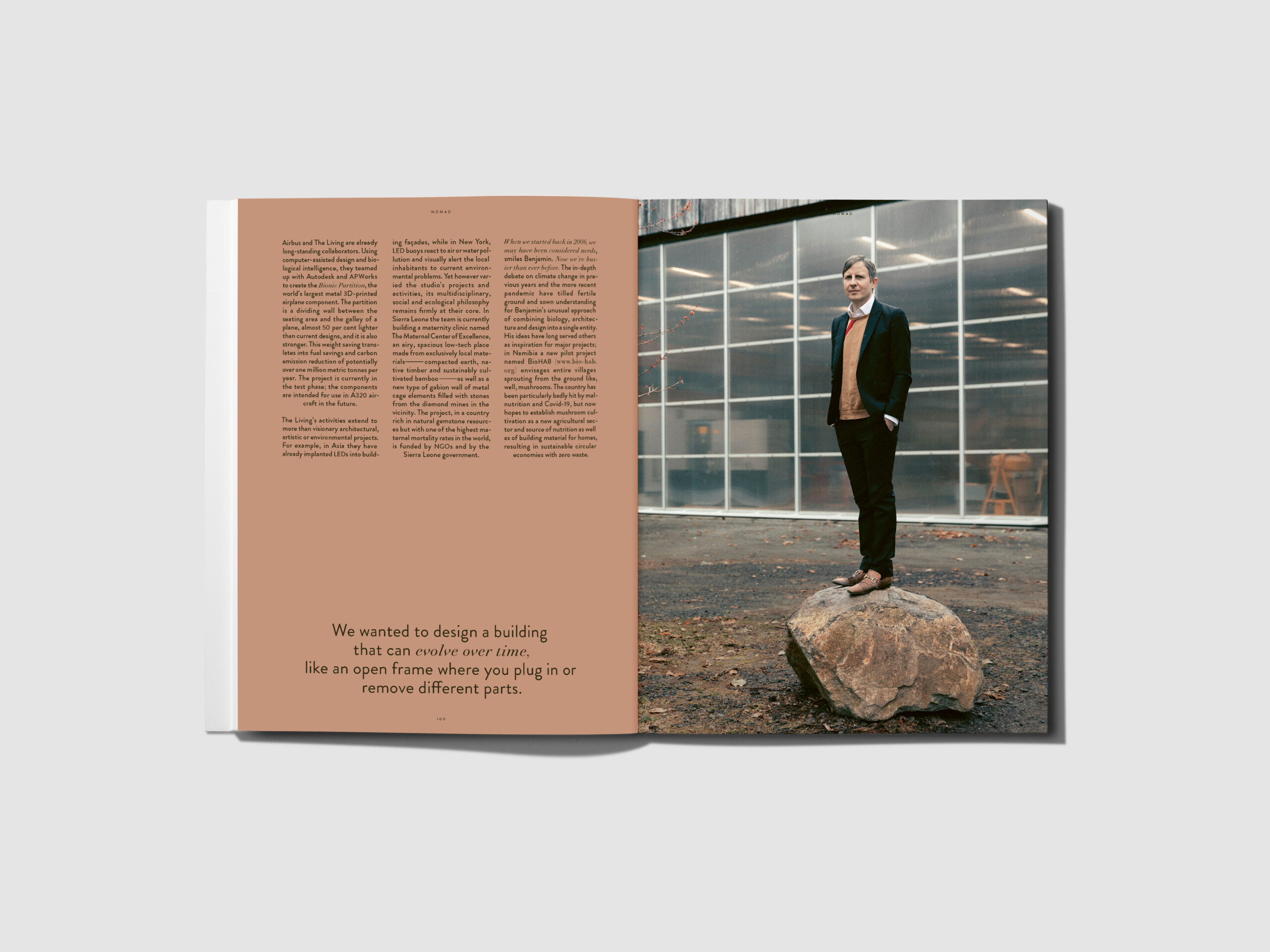 In our 10th issue, we focus on ‘Nature’-from matters of ethics to matters of innovation. We asked ourselves what dimensions we need to look beyond in order to understand nature; how human beings can resume their position as part of the organism that is nature, instead of playing the role of its disruptive factor; and what we can learn from nature in order to preserve our existence as a species. Prof. Michael Braungart, inventor of the cradle-to-cradle principle, says that today’s generation sees the environment as an issue of innovation. Felix Austen reflects on climate change and looks at the knowledge between what we know and what we don’t know yet. Read how Dutch artist and designer Christien Meindertsma uses artistic processes as a basis for developing new strategies to improve areas such as textile recycling. Or get to know Sep Verboom, a Belgian designer who works with traditional craftspeople, village communities and social cooperatives in countries including Brazil, Indonesia and the Philippines. Laura Luchtman and Ilfa Siebenhaar have developed a method of dyeing textiles using bacteria, thus eliminating the use of chemicals and cutting water consumption by around 90 per cent from its usual levels in the industry today. New York-based Architect David Benjamin uses mycelium cultures, bacteria, luffa sponges and biowaste to create the biotecture of tomorrow in his multidisciplinary studio, ‘The Living’. And Munich designer Stefan Diez recognises the need for classic product design to reinvent itself. He is increasingly aligning his work to his self-created code of 10 Circular Design Guidelines. Lidewij Edelkoort, one of the greatest trend forecasters, speaks about timing of the really big shifts in the way we work and live, and how nature can help us.