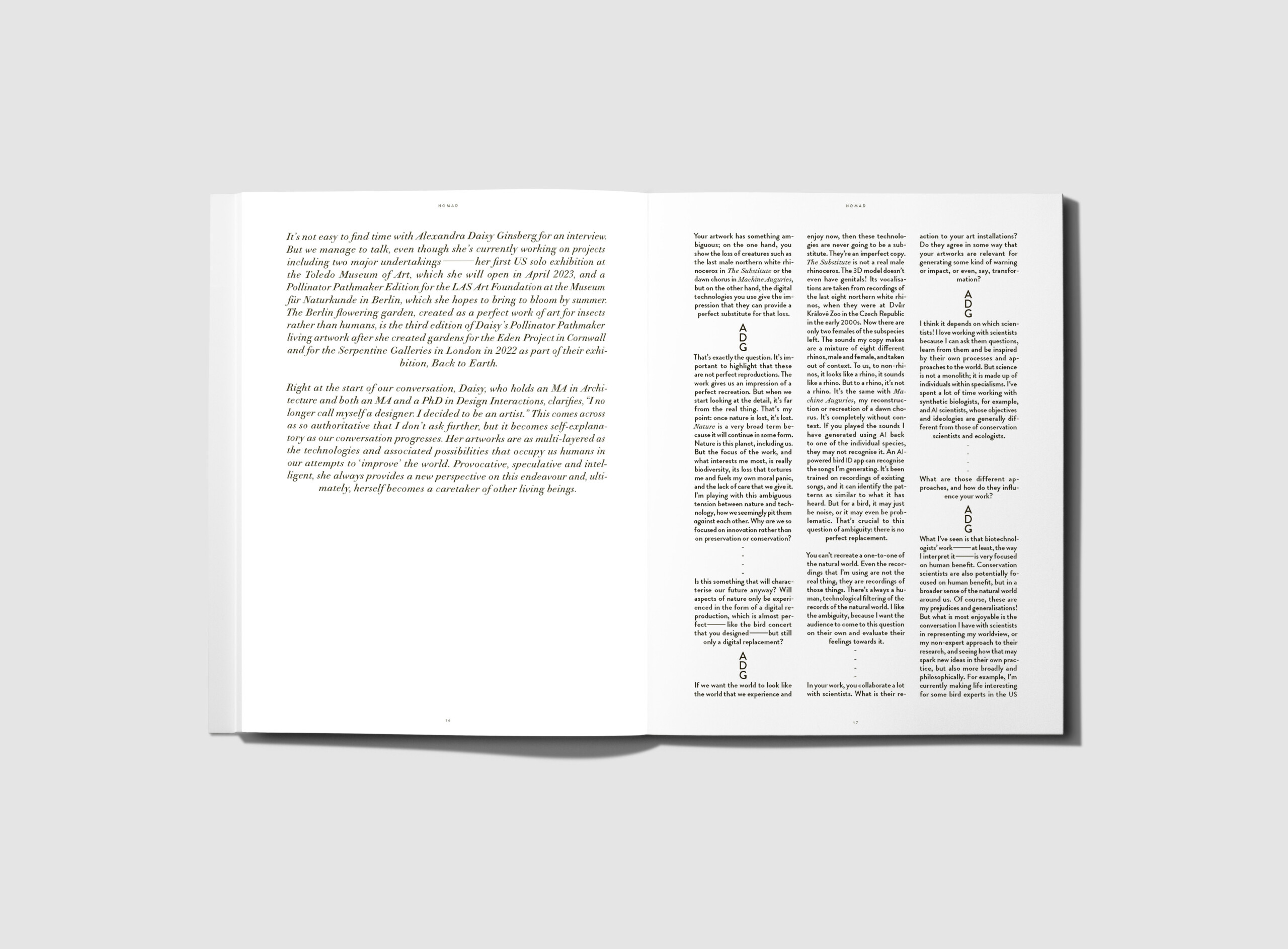 nomad features people who explore the relationship between humans and nature in their work, including artist Zheng Bo, designer duo Formafantasma, Studio Ossidiana, General and Artistic Director at Nieuwe Insituut Aric Chen, furniture manufacturers ecoBirdy, Studio Plastique, designer and architect Michele de Lucchi, artist Alexandra Daisy Ginsberg and many more.